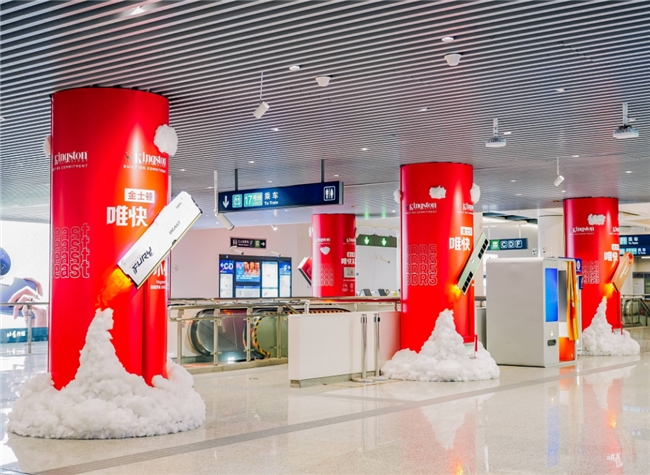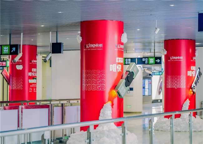 在工人体育场地铁站,承重立柱被焕然一新,金士顿的红色格外耀眼,每一根立柱融入"火箭喷射"立体造型,搭配亚克力材质与动态火焰灯效,打造"破壁二次元"的科幻场景,并且每组立柱上都有金士顿当前炙手可热的爆品形象,包括内存、固态硬盘、闪存盘、存储卡等。