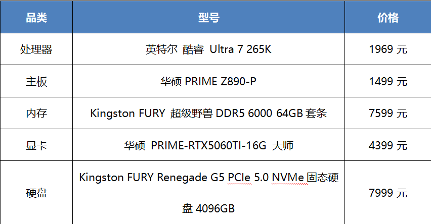 英特尔酷睿Ultra7 265K处理器8大核12小核20线程,大核频率3.9-5.5GHz,小核频率3.3-4.6GHz,二级缓存36MB,三级缓存30MB。主板选择了华硕PRIME Z890-P,采用14+1+2+1供电模组,4条内存插槽,最高可支持256GB的DDR5 内存,并提供了3组PCIe 4.0 M.2接口和1组PCIe 5.0 M.2接口。